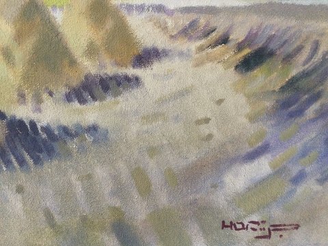 Knud Horup (1926-73): Høstparti med høstakke. Olie på lærred. Sign.: Horup Uden ramme 60x70