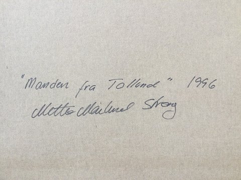 Mette Mailund Strong (født 1967): Portræt at Tollundmanden 1996. Olie på lærred. Sign.: Mette Mailund Strong 1996 (bagpå lærred) Titel - Manden fra Tollund. 89x84 (93x88)