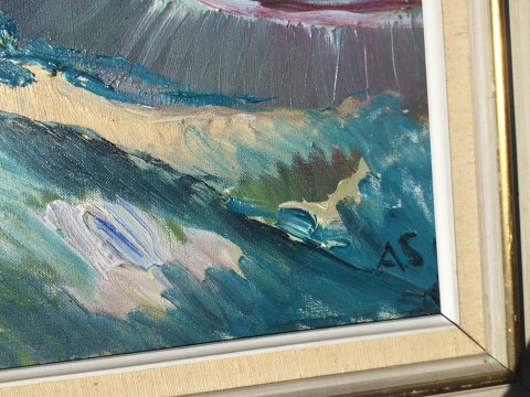 Aage Strand (1910-75): Kystparti med klitter og graner. Olie på lærred. Sign.: AS Løs i rammen 60x70 (78x88) Åge Strand