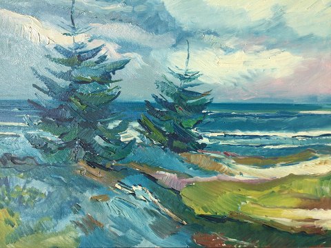 Aage Strand (1910-75): Kystparti med klitter og graner. Olie på lærred. Sign.: ÅS Tidligere solgt på Bruun Rasmussens Auktioner i København 70x100 (88x118) Åge Strand
