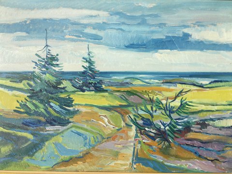Aage Strand (1910-75): Kystparti med klitter og graner. Olie på lærred. Sign.: AS 67x97 (75x105) Åge Strand