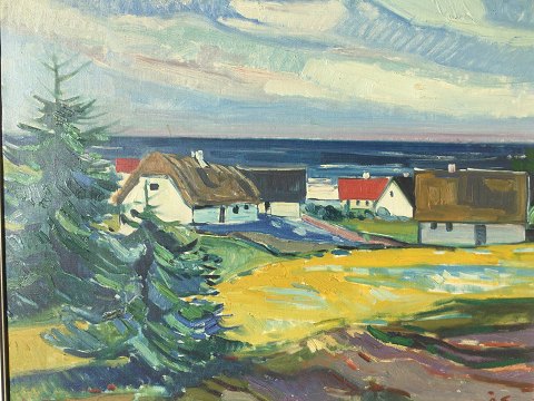 Aage Strand (1910-75): Kystparti med gårde. Olie på lærred. Sign.: ÅS 52x62 (66x77) Åge Strand