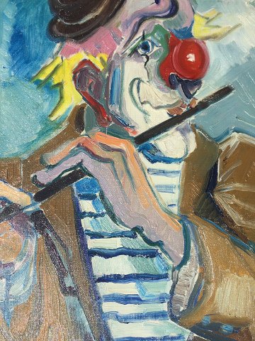 Aage Strand (1910-75): Fløjtespillende klovn. Olie på lærred. Sign.: ÅS 61x52 (73x64) Åge Strand