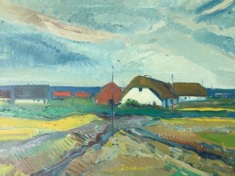 Aage Strand (1910-75): Kystparti med gårde. Olie på lærred. Sign.: ÅS 70x100 (85x115) Åge Strand