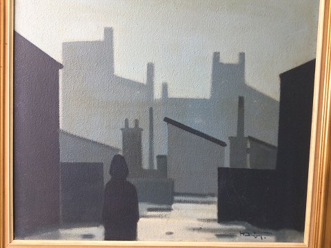 Knud Horup (1926-73): Person og bygninger i industrikvarter. Olie på lærred. Sign.: Horup 60x70 (79x89) 14723