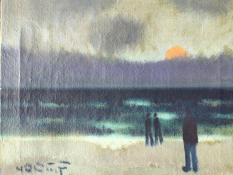Knud Horup (1926-73): Personer på stranden ved solnedgang. Olie på lærred. Sign.: Horup Uden ramme. Bagpå blindramme - no 17995. 40x50 16923