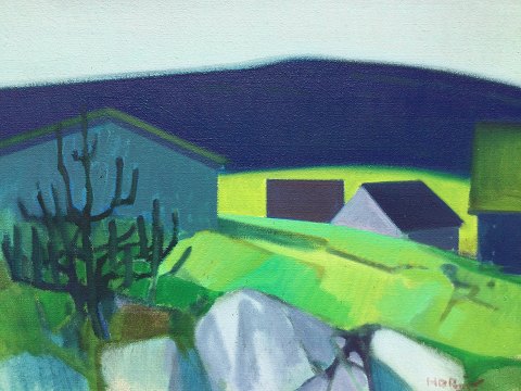 Grønt og blåt regnskab med stendige og nøgent træ.