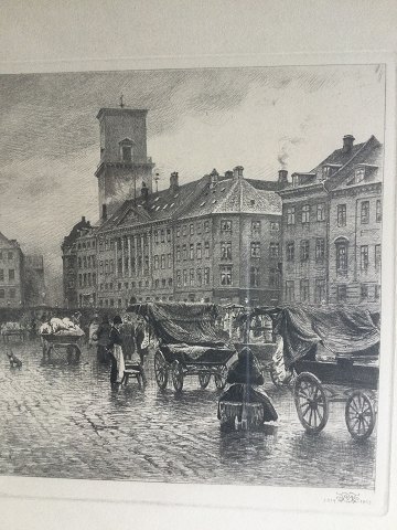 Nytorv i København med slagtervogne og Vor Frue Kirkes tårn i baggrunden, 1905.