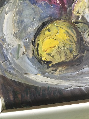 Ruth Weber (1894-1977): Opstilling på bord med blomster i vase og frugt. Olie på plade. Sign.: Ruth Weber 50x45 (57x52)