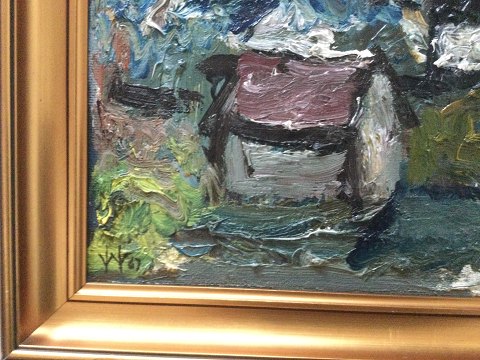 William Hansen (1908-91): Landskab med huse 1967. Olie på plade. Sign.: Monogram 67 32x52 (38x58) William Hansen var uddannet fra Teknisk Skole i Odense 1924-26 ved A.C. Tersløse og Marlo Joensen.