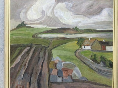 Eline Hertz-Jespersen (1879-1958): Landskab med nypløjede marker 1957. Olie på plade. Sign.. EHJ (monogram) 57. 62x65 (66x69) Eline Hertz Jespersen var gift med kunstmaler Knud Jespersen.