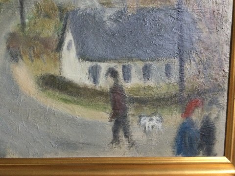 Marie Vandmose (1913-93): Personer på vej gennem by. Olie på plade. Signeret bagpå - Marie Vandmose. 58x67 (66x75) Marie Vandmose var gift med kunstmaleren Knud Vandmose Larsen (1912-83). 2324