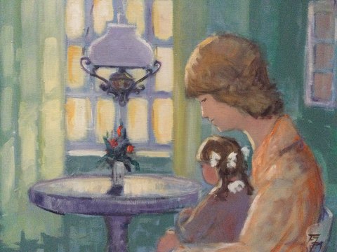 Finn Johansen (1942-2006): Mor og barn ved vindue. Olie på lærred. Sign.: FJ 50x60 (64x74) 37104 Finn Johansen var elev af Sven Dalsgaard, Randers 1968-72.