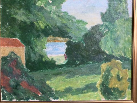 Helge Jensen (1899-1986): Haveparti med kig til sø 1945. Olie på lærred. Sign.: Helge Jensen - 45. 51x65 (60x73) Helge Jensen var elev af Harald Giersing (1915-16). 38520