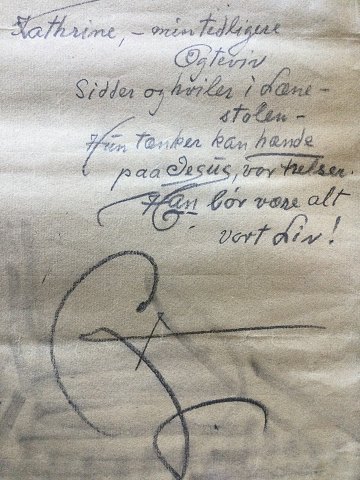 Betegnet - Kathrine - min tidligere ægteviv - Sidder og hviler i Lænestolen - Hun tænker kan hænde paa Jesus, vor Frelser - Han bør være alt vort Liv - sign.: K.