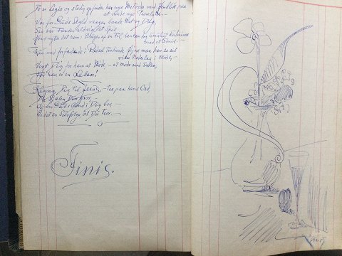Hans Jørgen Korn (1888-1963): Håndskrevet bog omhandlende kunstnerens tanker og Gudstro med maser af tegninger og vignetter.