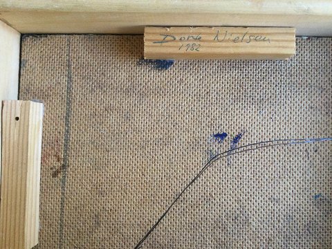 Ann-Dorte Nielsen (født 1952): Sydlandsk landskab 1982. Olie på plade. Sign.: ADN Bagpå - Dorte Nielsen 1982. Indrammet 18x25 24224