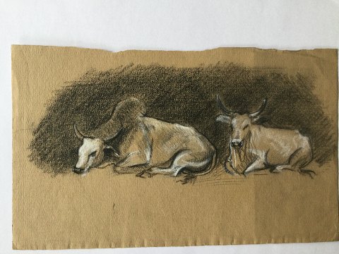 Torkil Norél (1922-2009): Liggende okser. Kul/hvidkridt pĺ papir. Sign.: usigneret Uden ramme 19x31 5924