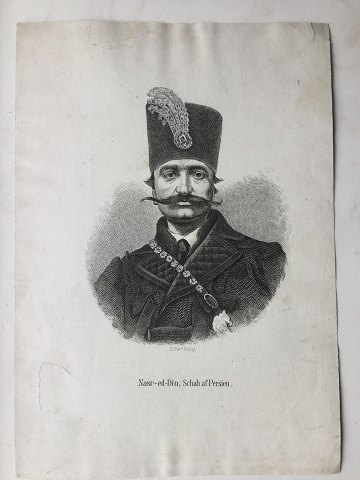 Ubekendt kunstner (19 årh): Portræt af Shahen af Iran - Nasser-al-Din (1831-96). Litografi på papir. Betegnet - NASR-ed-Din, Schah af Persien S. Trier's Forlag Uden ramme 27x19 46921