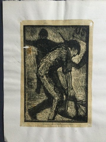 Sven Enselmann (1926-2004): 2 personer i landskab. Træsnit på japanpapir monteret på papir. Sign.: Sven Enselmann Revne i japanpapir Uden ramme. Snittet måler 17x11 - papiret måler 22½ x 17