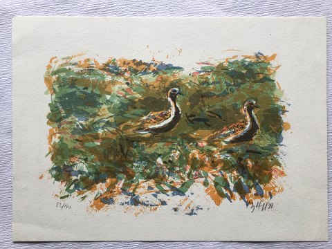 Mogens Hoff (1934-2008): 2 hjejler i landskab 1999. Farvelitografi på papir. Sign.: Mg. Hoff 99 Nr. 82/140 uden ramme 25x35