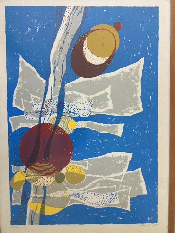 Helge Ernst (1916-91): Komposition. Farvelitografi på papir. Nummer 437/500 Sign.: Helge Ernst (bly) og HE i trykket Indrammet 73x53 32709