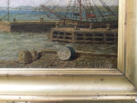 Emma Meyer (1859-1921): Havneparti 1892 Olie på lærred. Noget krakelleret. Sign.: E.M. 1892 Smuk antik "sølv" ramme. 24x35 (32x42) 7825