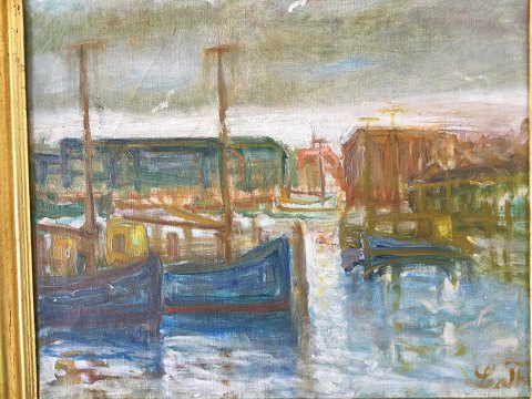Leo Thellefsen (1909-97): Havneparti - Antagelig Esbjerg havn. Olie på lærred. Sign.: Leo Th. Smuk guldramme. 37x44 (45x51) Leo Tellefsen var uddannet fra Aalborg Tekniske Skole. 11025