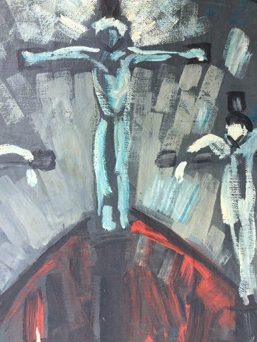 Eigil Moe (1909-89): Golgata scene 1959 Olie på lærred. Sign.: E. Moe 59 Lille brist i lærredet (se foto af for- og bagside) Indrammet 96x84 Eigil Moe var søn af kunstmaler Andreas Moe.