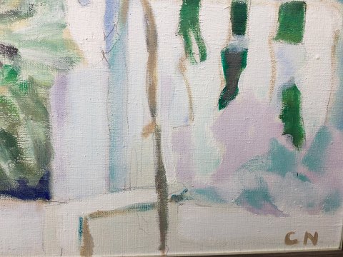 Christel Nolle (født 1951): Eksteriør ved hus på Skiros, Grækenland 1990. Olie på lærred. Sign.: CN Bagpå - Christel Nolle 1990 - Skiros Greece. 55x65 (61x71) 14025