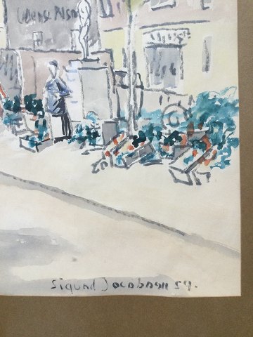 Sigurd Jacobsen (20 årh): Markedsdag i Odense 1959 Akvarel på papir Sign.: Sigurd Jacobsen 1959 57x40 (75x56) 20825