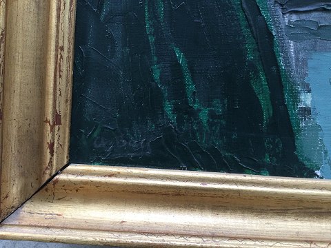 Alfred Bay (1905-86): Landskab med huse. Olie på lærred Sign.: A. Bay Udstillingsnummer bagpå meget smuk guldramme. 66x98 (76x106) 25025