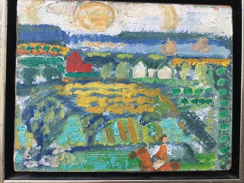 Leo Thellefsen (1909-97): Landskab med huse og kvinde til hest. Olie på plade. Sign.: Leo Th. Svæveramme. 13x17 (17x21) Leo Tellefsen var uddannet fra Aalborg Tekniske Skole. 25025