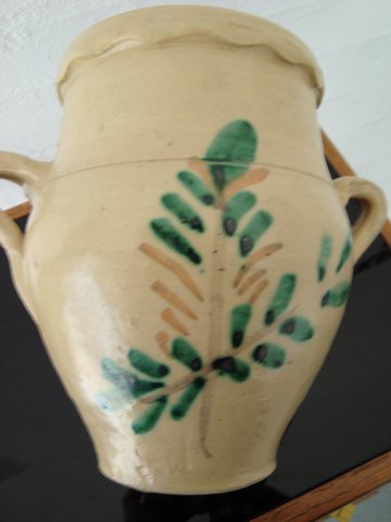 Gammel lerkrukke med 2 hanke. Ecru glasur med brun og grøn grendekoration. Højde 20 cm.