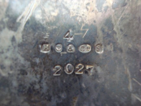 Tin Tekande med ligeknækket korpus. Dekoreret med rococomotiver og kartoucher. England år ca. 1880. Stemplet: 2027 samt diverse stempler. 15x26x11