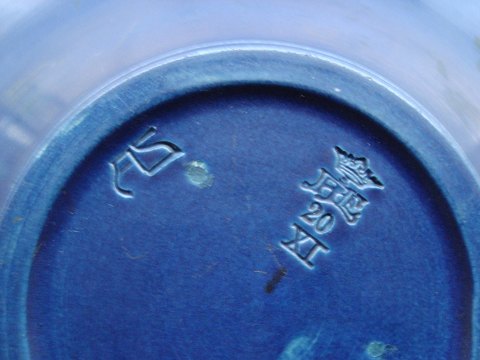 Axel Sørensen (1891-1967): Dyb blå bordskål med relief dekoration. Lavet for P. Ipsens Enke Bornholm. Stemplet: AS PIE Denmark 20 XI. Diamter -26½ cm. Højde - 7 cm.