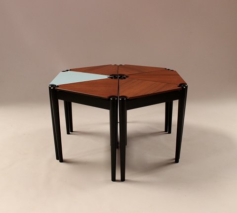 Coffee table designed by Severin Hansen in rosewood, produced by Haslev Møbelsnedkeri in collaboration with Royal Copenhagen. The tabletop is inlaid with ceramic “Baca” tiles by Nils Thorsson – each with its own unique expression in blue and earthy shades. The table combines Danish joinery and artistic ceramics into a refined whole, and the characteristic bevel joints testify to great precision in the workmanship.