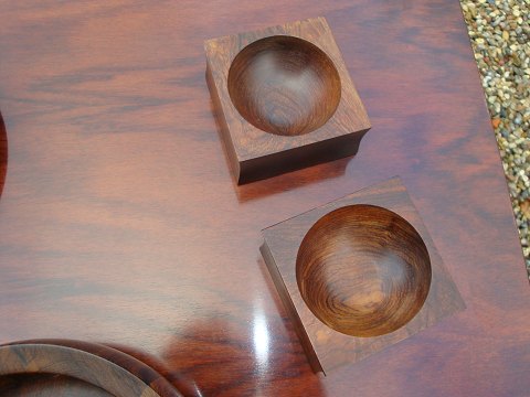 Various small items manufactured in rosewood. Danish design from the 1960s, The one with the handle is designed by George Jensen.
