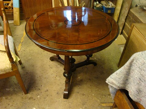 Der er desværre ikke foto af bordet før vi gik i gang med arbejdet. Bordet er istandsat efter den gammeldags metode med håndpolering m.m. Bordet havde en meget stor brandskade.
