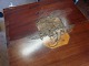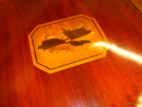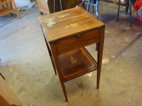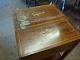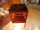 Bordet havde en vandskade ovenpå klappen og under klapperne. Vi har restaureret bordet og indlagt ny intarsia. Se før og efter foto.