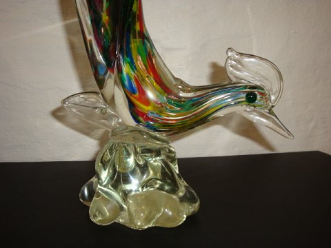 SolgtGlaskunst figur i form af en påfugl i flotte farver fra Italien Murano. Højde 49 cm.