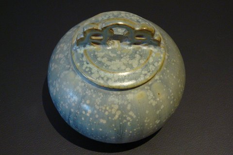 Lågvase, kgl i grøn/blå farve. Dateret