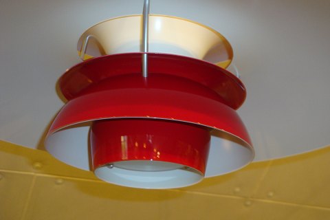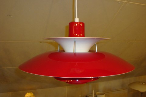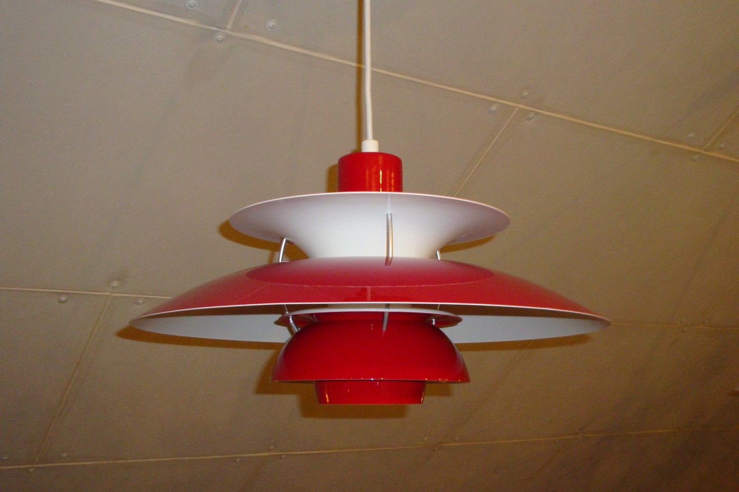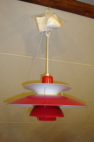 SolgtPoul Henningsen loftlampe PH5 i flot rød højglans. Lampen fremstår i perfekt stand og er en udstillingsmodel, sælges med certifikat.