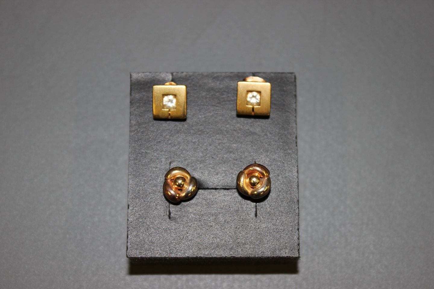 Et par 8 kt ørestikker med zirkoner. Pris 750 kr. Et par 14 kt ørestikker, pris 850 kr.