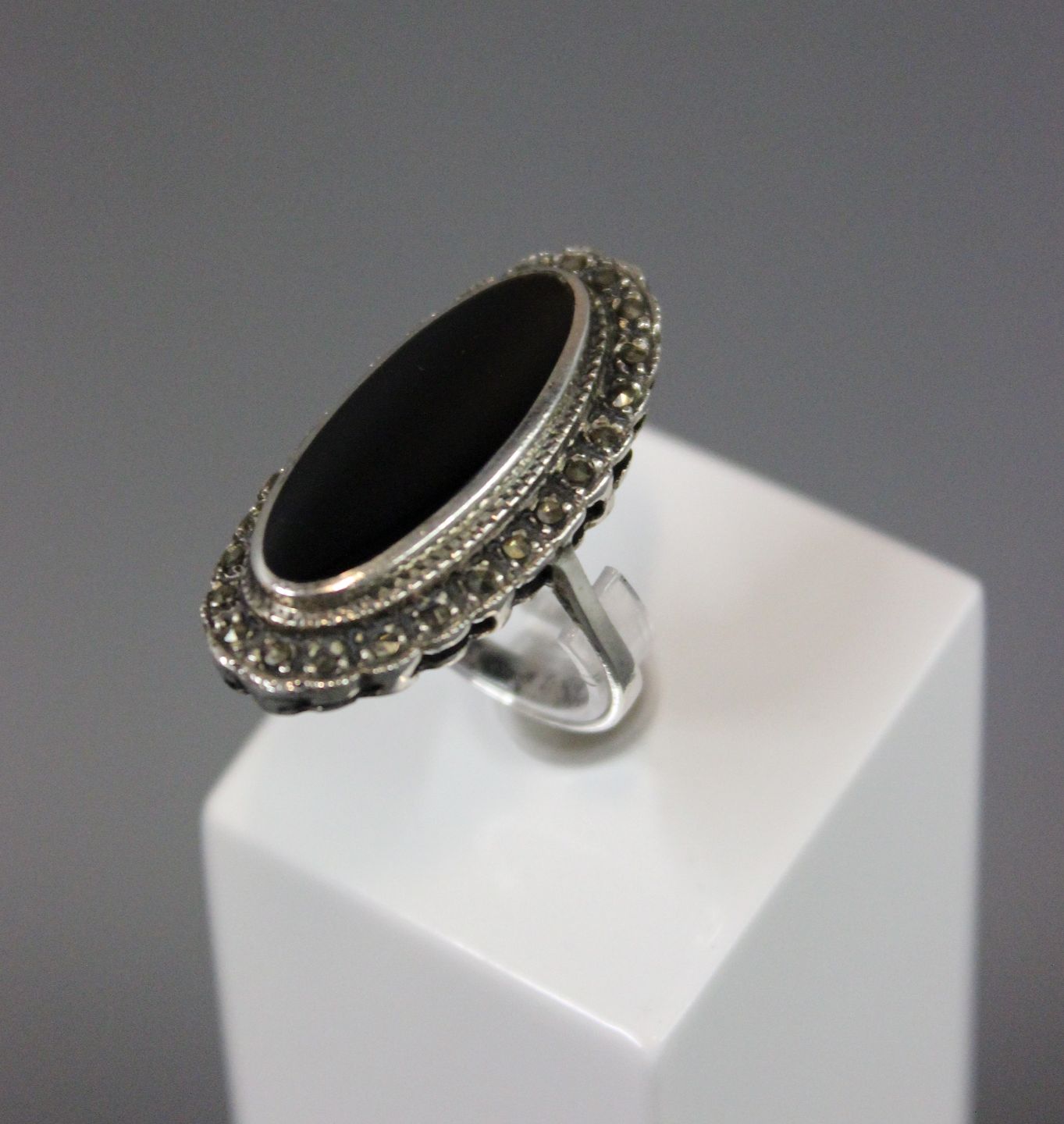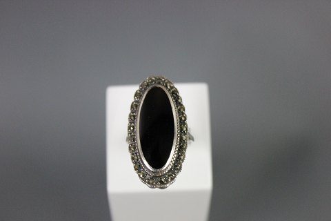 Sølv ring 925s med stor oval onyks, omkredset af similisten. Str 58.