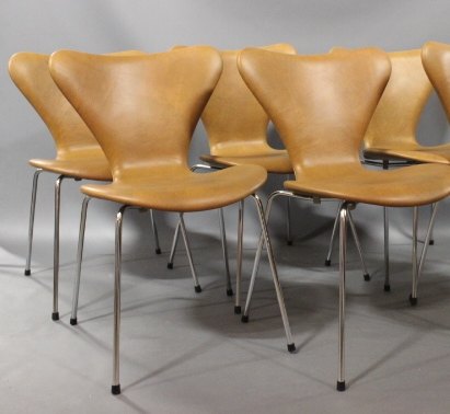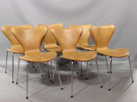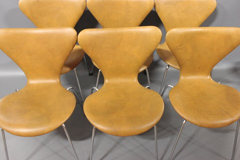 Sold6 chairs By Arne Jacobsen re-upholstered with leahter in cognac. Model 3107