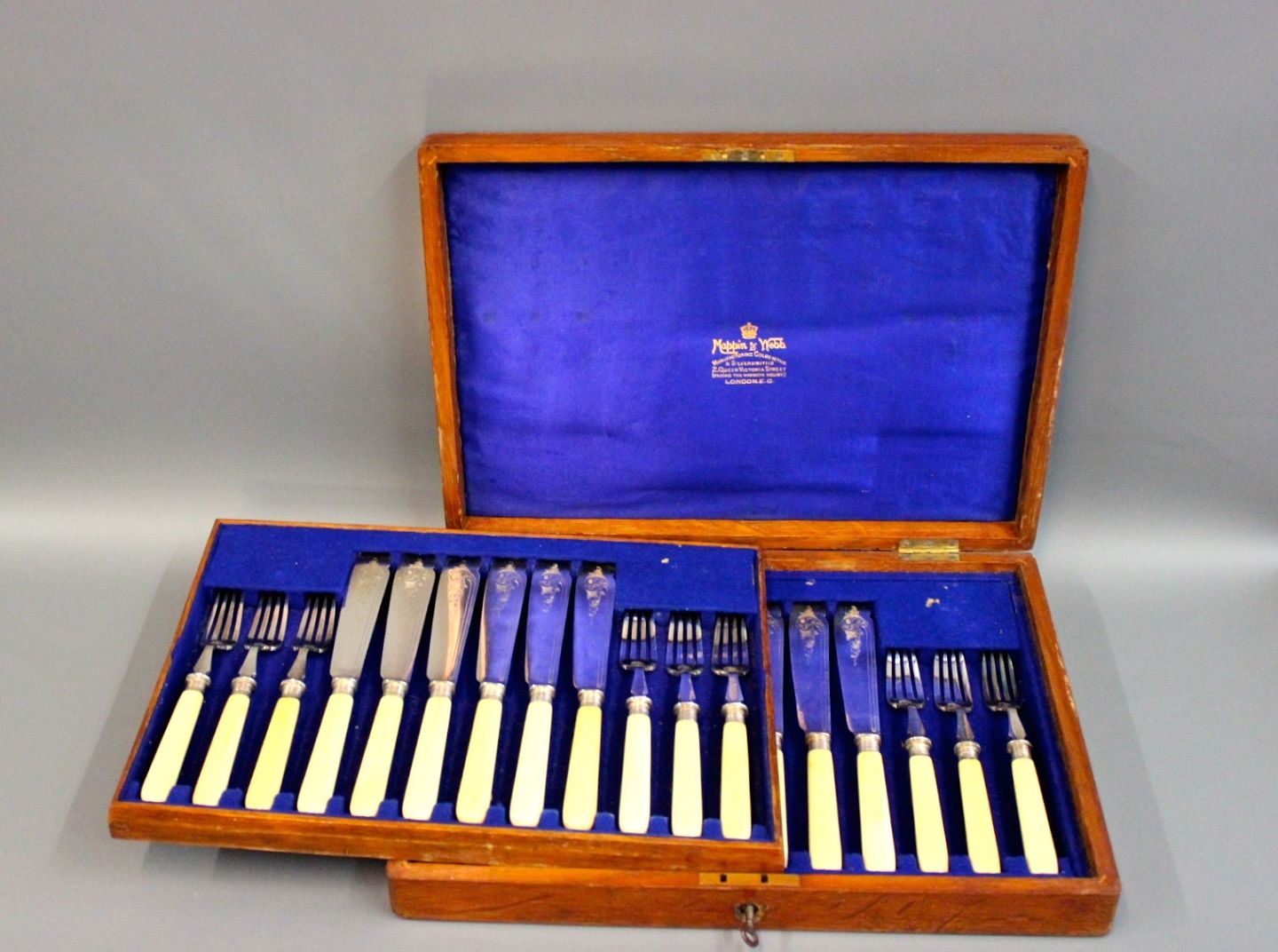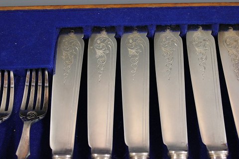 SolgtMappin og Webb 12 pers. fiske bestik med tilhørende boks med blå fløjl indvendigt. Bestikket er i forsølvet sølv med elfenbens håndtag. Sættet er fra England og fra år 1880.