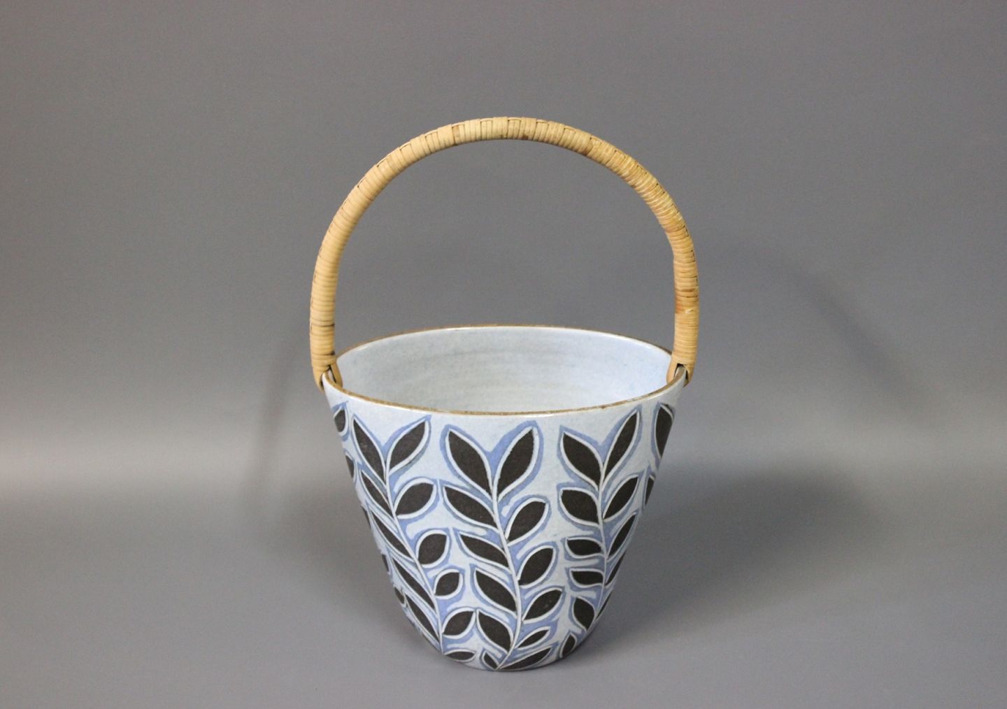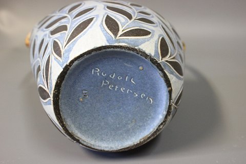 SolgtLyseblå keramik vase med mørkeblåt bladmønster og træhank af Rudolf Petersen.