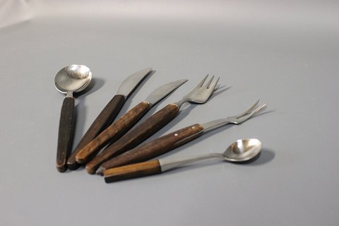 Cutlery set in Rosewood consisting of tablespoons, dinner- and lunch knifes and lunch forks, carving fork and demitasse spoon. The set is Danish Design from the 1960s.