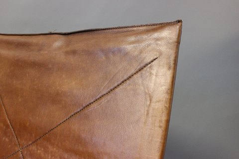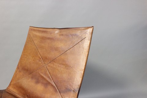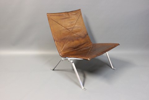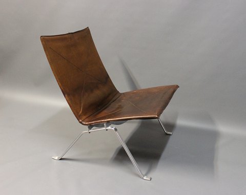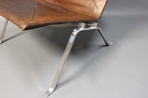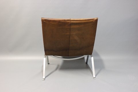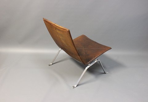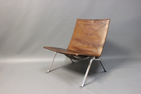 SolgtLænestol, model PK22, i originalt patineret læder og børstet stål. Designet af Poul Kjærholm i 1956 og produceret af E. Kold Christensen.